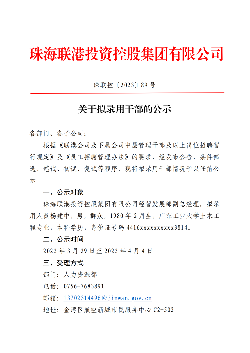 珠聯(lián)控〔2023〕89號(hào) 關(guān)于擬錄用干部的公示