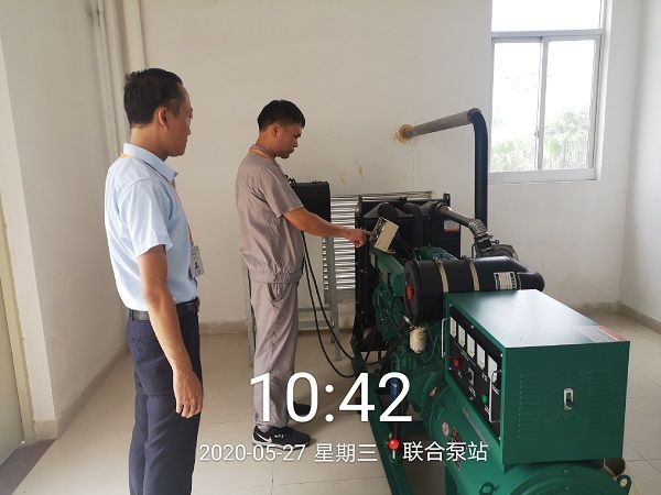 與此同時,演練還模擬暴雨、臺風天氣突發(fā)停電時,水泵無法正常工作,值班人員立即切斷市電總開關(guān),并啟動備用發(fā)電機為水泵供電,確保泵站的照明及泵站各閘門的正常啟閉。