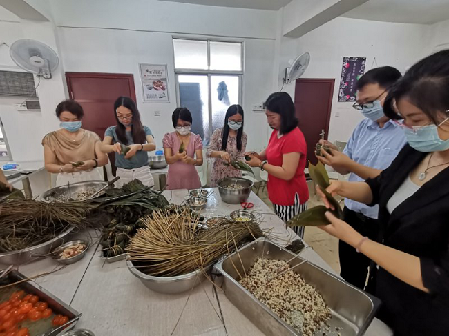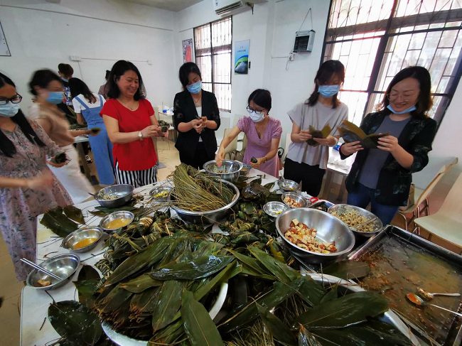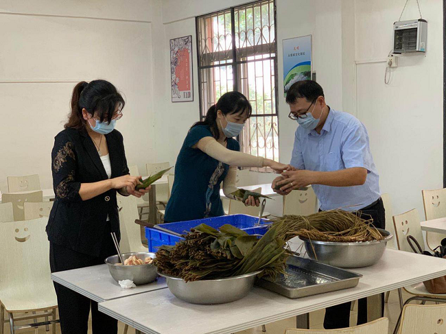 活動(dòng)現(xiàn)場(chǎng)準(zhǔn)備了糯米、粽葉、板栗、蛋黃等材料,大家圍在一起,從嘗試、普及到大展身手,歡聲笑語、棕葉飄香,參與人員包得不亦樂乎。