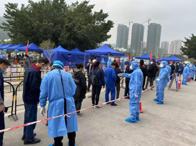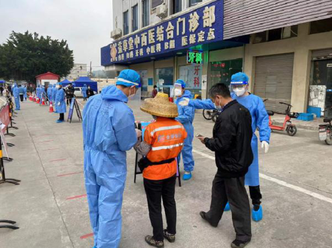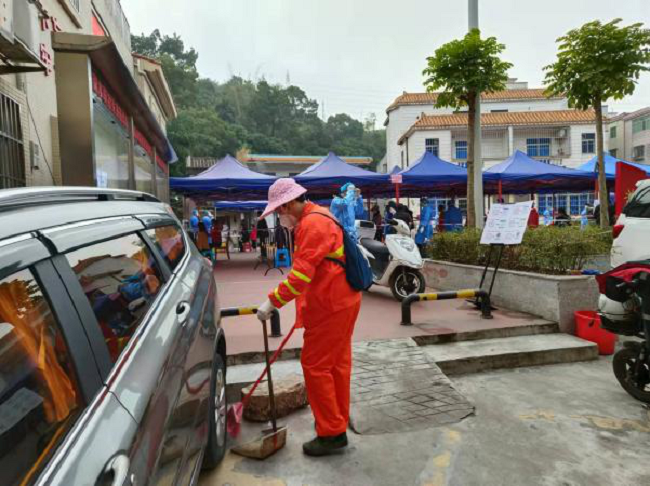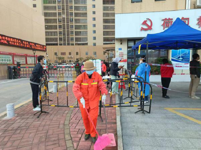 匯建公司環(huán)衛(wèi)工人不畏嚴寒、盡職盡責,幫助社區(qū)工作人員迅速搭建核酸檢測設(shè)施,引導社區(qū)居民掃碼,細致做好核酸檢測點各項工作,扛起責任與擔當。